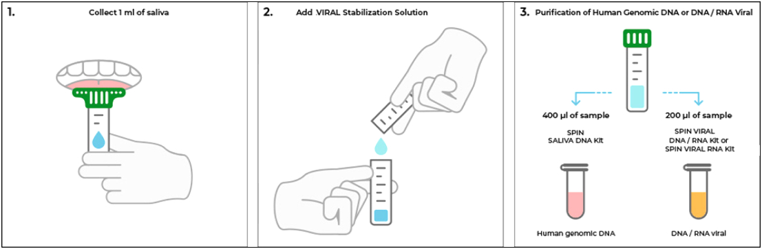 REAL SALIVA VIRAL Sample Collection Kit provides a safe and rapid all-in-one procedure for the collection, stabilization and transportation of 1 ml saliva samples at ambient temperature that stabilizes viral DNA/RNA.